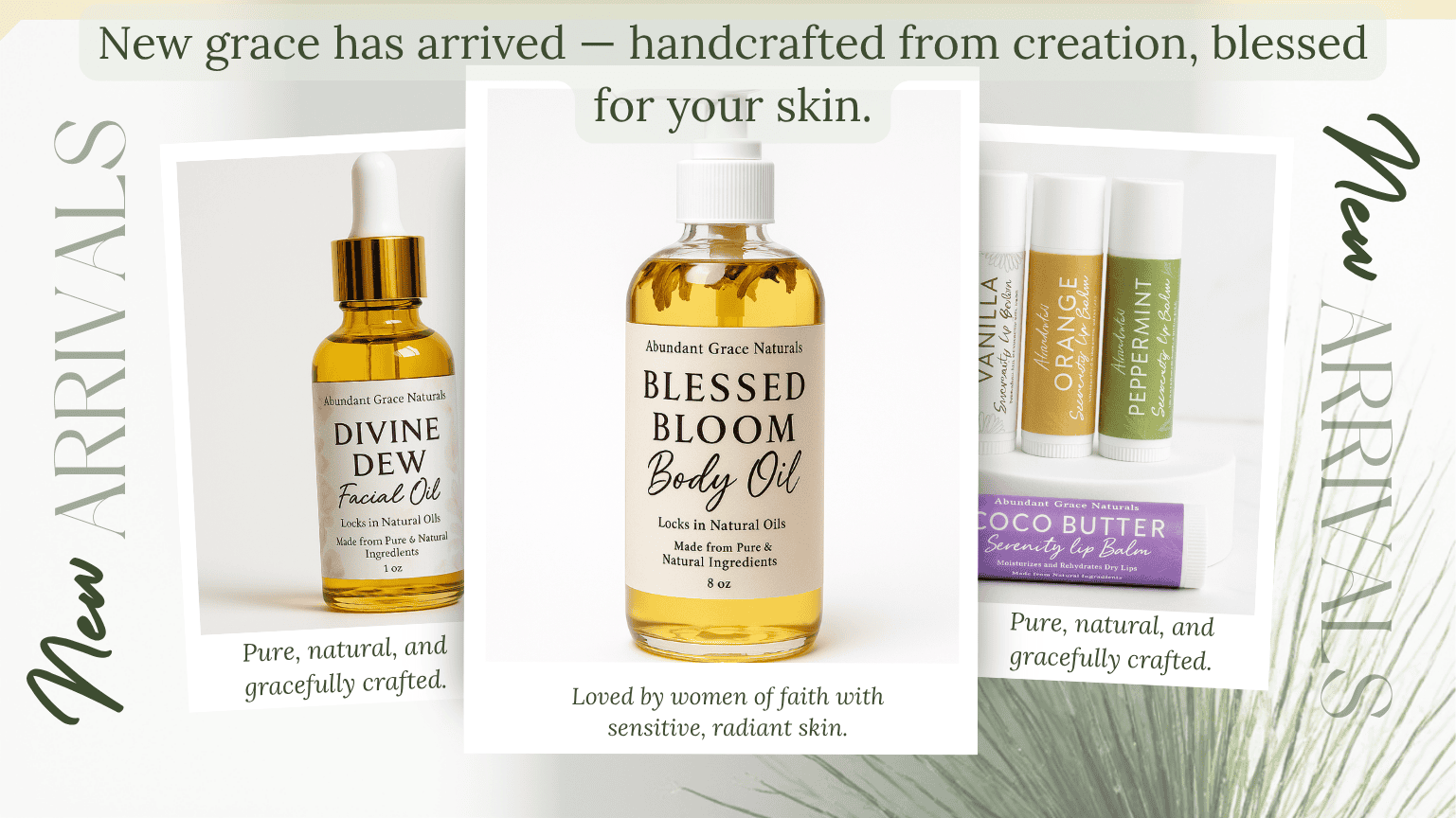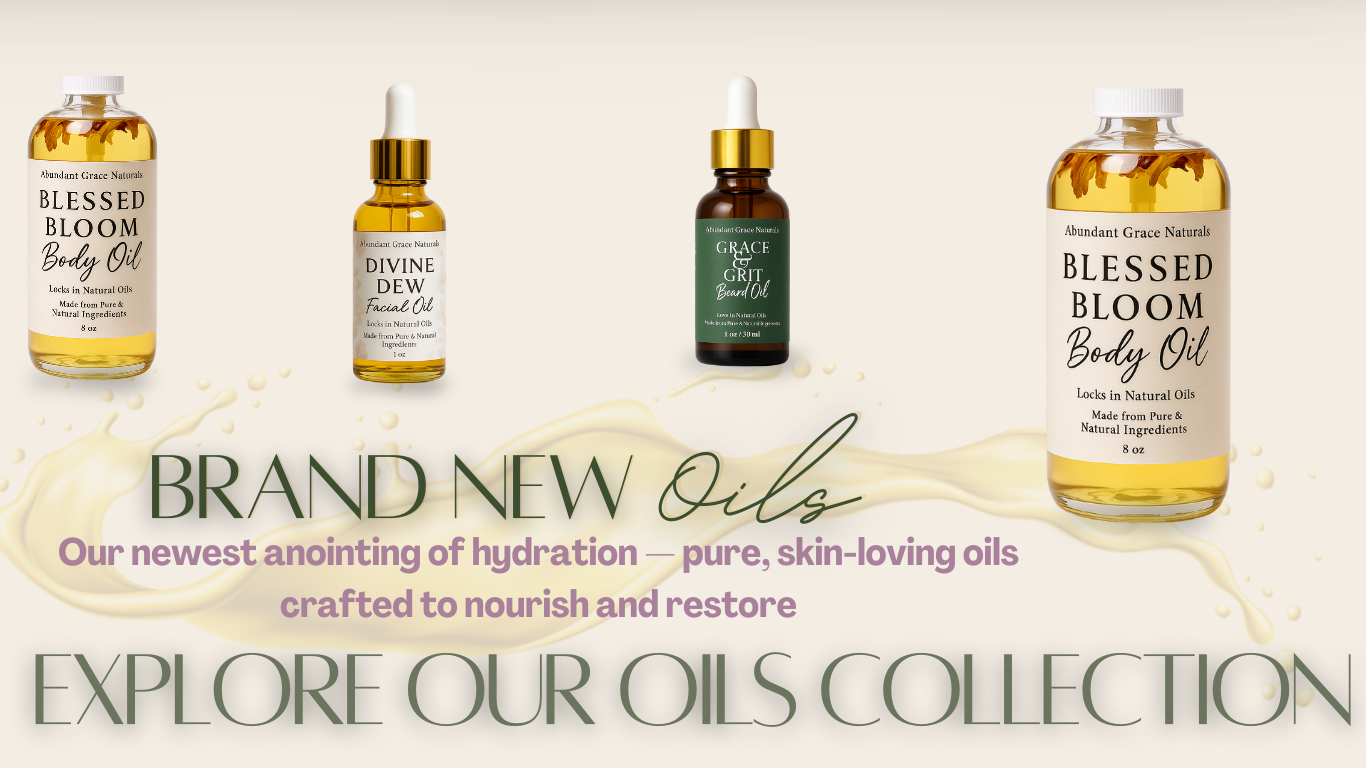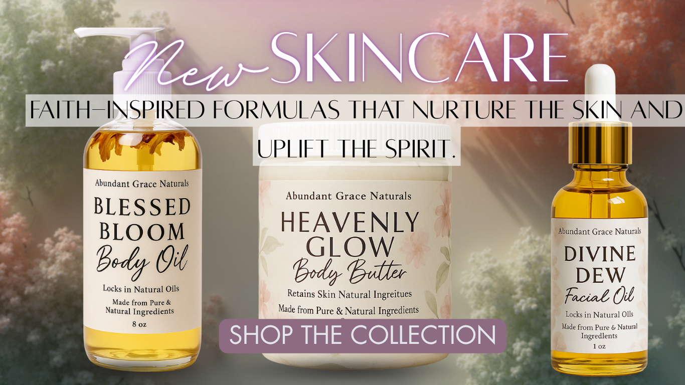 At Abundant Grace Naturals, our mission is to share the blessings of God’s creation through gentle, faith-inspired skincare. Each product is crafted to nurture your skin with natural ingredients — and remind you that true beauty begins with grace.